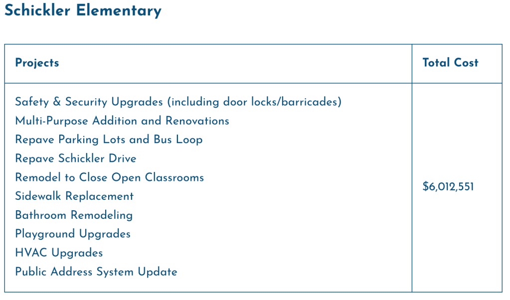 As you may have noticed, we have more funds earmarked for Schickler than any other elementary school. There are a couple main reasons for this: