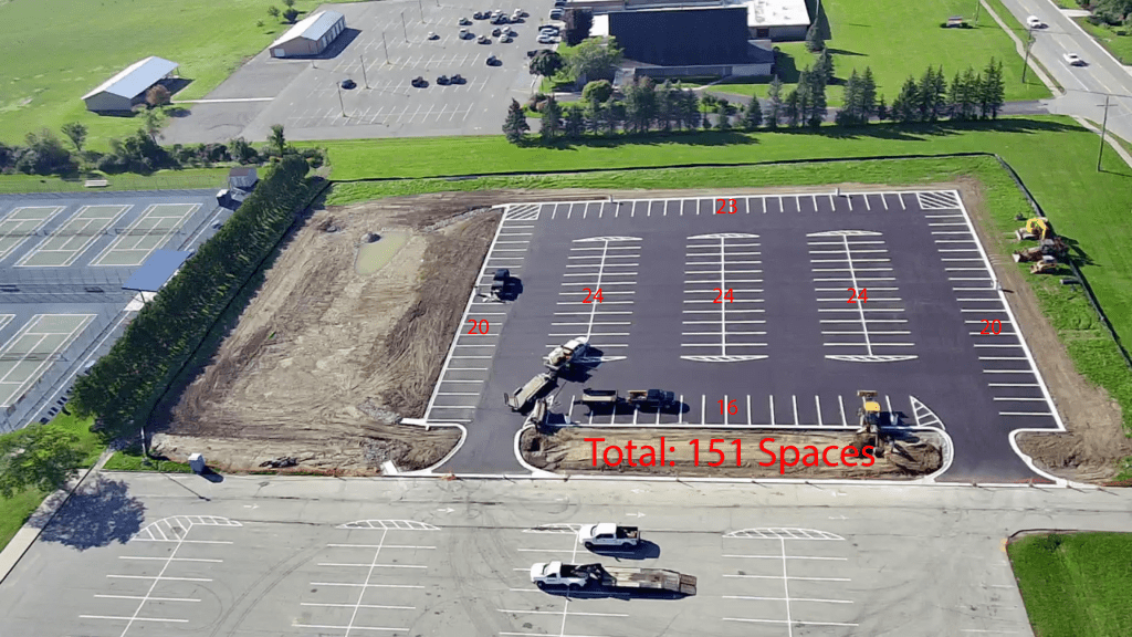 Here’s an overhead view of the new parking lot on the south side of CFI. To the east is the new retaining pond that will help us with our water problem at the tennis courts.