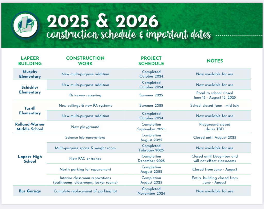 June 6, 2025: Lapeer High School north parking lot closed for milling work