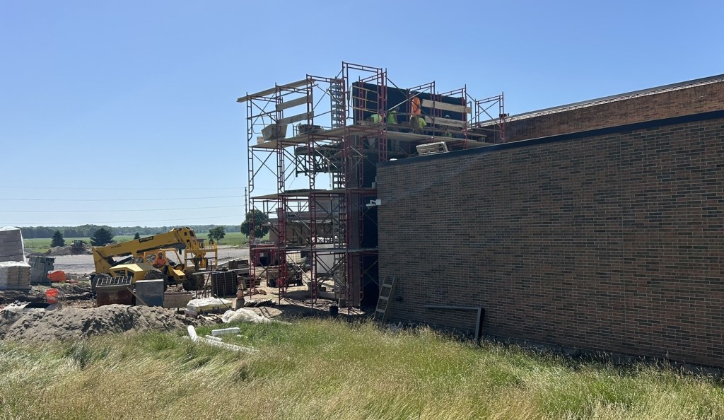The new lobby for the new auditorium/performing arts center has started, as has the milling work on the north parking lot in preparation for that lot to be paved later this summer.